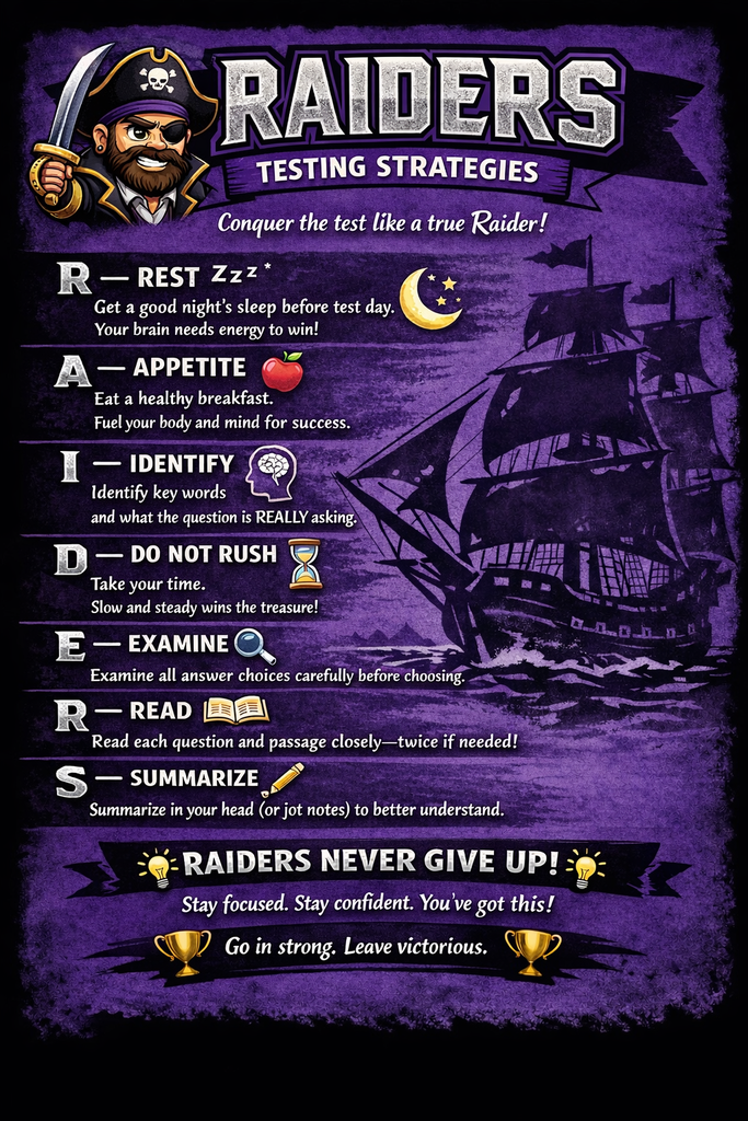 We encourage all of our students to come prepared, stay confident, and give their very best effort each day. These assessments are an opportunity to show what you’ve learned and how much you’ve grown this year!